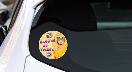 Sticker humour voiture – Blonde au volant – Autocollant Pop Art femme drôle