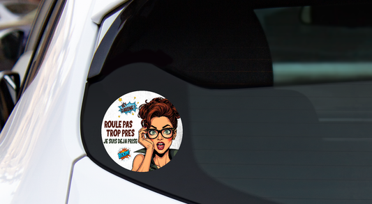 Sticker humour voiture – Roule pas trop près je suis déjà prise – Autocollant Pop Art femme drôle