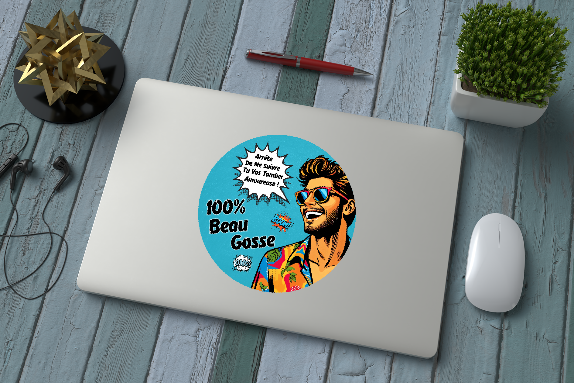 Adesivo divertente 100% bel ragazzo – Adesivo retrò pop art con uomo divertente, vinile resistente, prodotto in Francia
