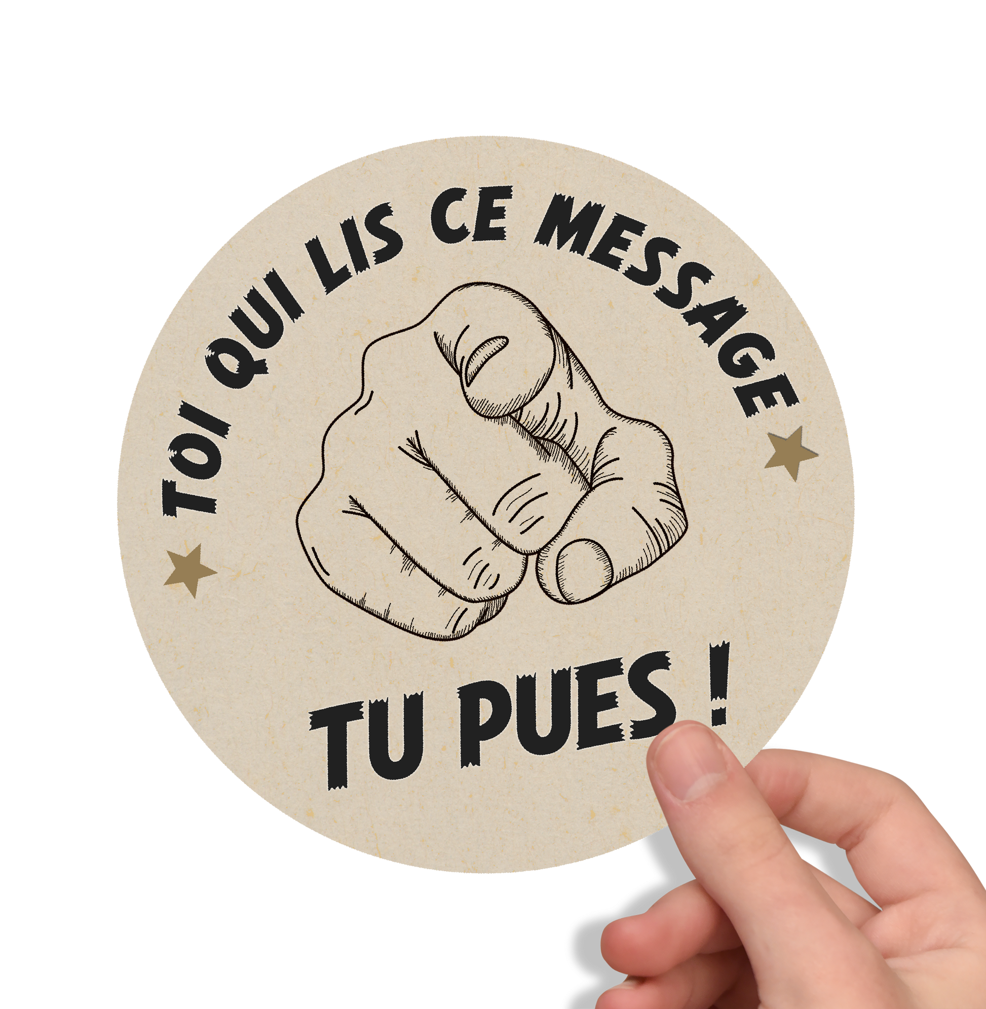 Ce sticker rond “Toi qui lis ce message… tu pues !” est fait pour celles et ceux qui adorent l’humour bien cash. Un design façon affiche vintage, une main qui pointe droit sur le curieux… et bim, le message fait mouche.