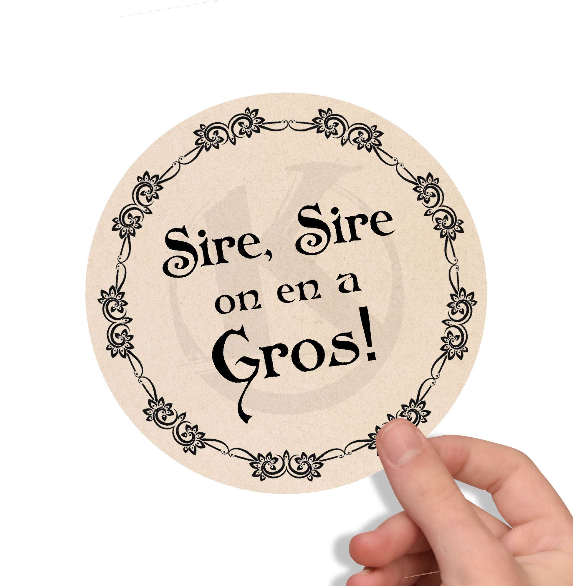 Avec ce sticker rond “Sire, Sire, on en a gros !”, rends hommage à la réplique légendaire de Perceval qui résume si bien nos journées parfois épiques 😆